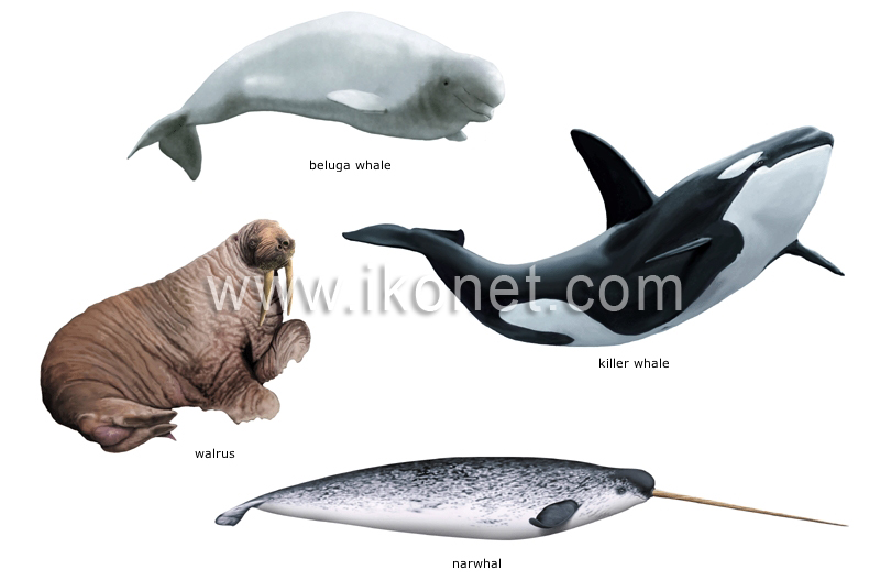 Amphibious marine mammal of arctic regions; it is hunted for its hide, blubber and ivory tusks.