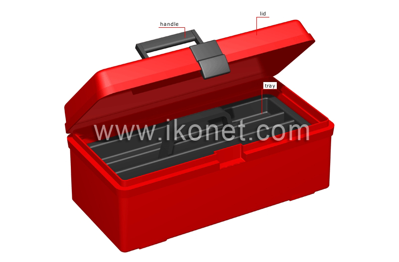 Rigid detachable container, divided into compartments and usually used for storing hardware or small tools.