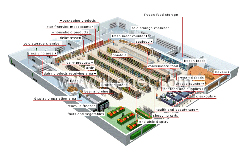 A large self-service store that sells food and various everyday household goods; the part accessible to shoppers is surrounded by service areas reserved for storage and for preparing and preserving merchandise.