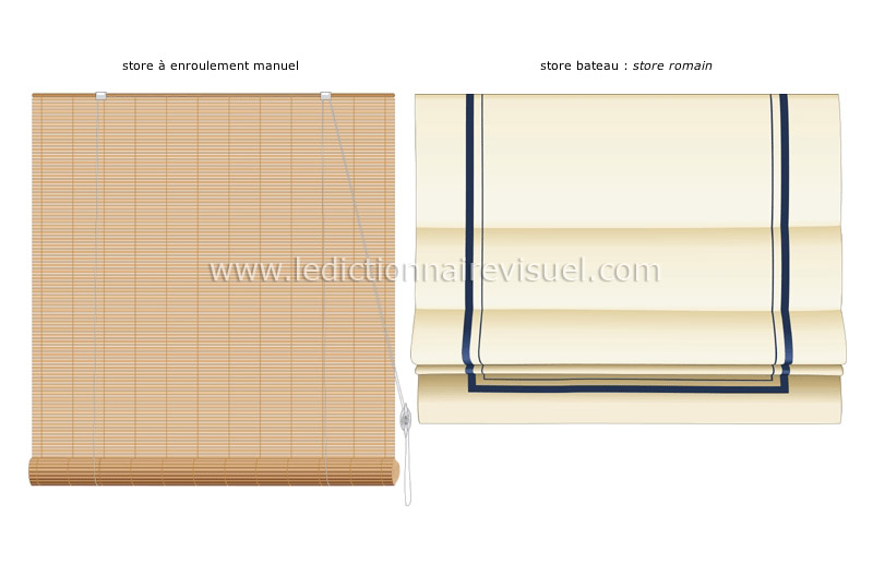 Store qui, lorsqu’on le remonte, forme des plis superposés grâce à des cordons coulissant dans des anneaux sur l’envers du tissu.