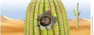 La chevêchette des saguaros est la plus petite chouette du monde. Sa taille ne dépasse guère 15 cm ! Active la nuit, elle cherche inlassablement les insectes dont elle se nourrit. Le jour venu, la chevêchette s’installe dans un trou creusé par un pic, dans un grand cactus saguaro du sud des États-Unis ou du nord du Mexique.